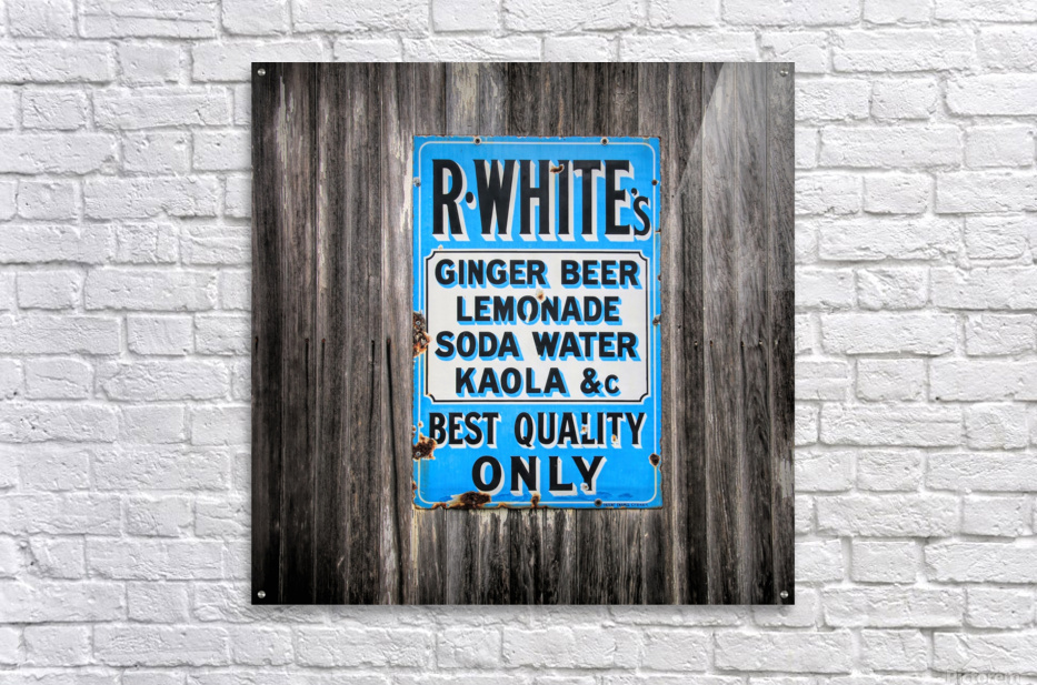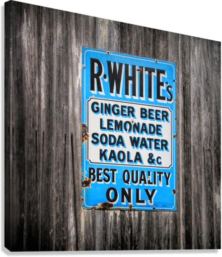 This metal sign is displayed at an antique car shop. The sign is one of several vintage signs. R. White is a soda that is still produced in Great Britain. It has been around for over 150 years.